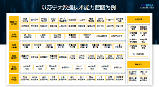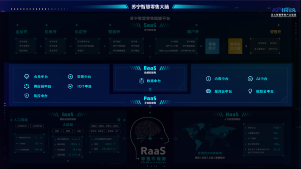 Another practical case is Suning Retail's "Smart Retail Brain" concept, called "Retail as a Service". With so many people talking about digitalization, is there a retail company with technological capabilities that can empower the entire retail industry? So we propose RaaS. You may not know much about Suning's current R&D strength, which is relatively strong, which is rare in the retail industry. We gathered them not only engineers, but also retail experts. Separately pull out the infrastructure of artificial intelligence and big data to make a service; at the PaaS level of the platform, we pull out some common business, such as membership, transaction, supply chain, etc., to make a platform. In terms of AI, there are three basic computing platforms, which allow our computing engineers to develop many applications on them, and also allow us to have more than 80 AI retail scenarios and 150 AI skills that can be invoked . Create a big data middle platform that can carry many SaaS applications, such as finance, logistics, supply chain, marketing, and various user-based SaaS services: