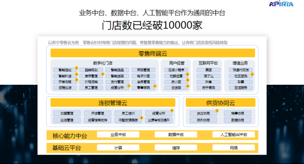 Here is Suning as an example: Suning has a product called Retail Cloud, which mainly focuses on the "sinking market" dominated by counties and towns, and consumer goods dominated by 3C. Driven by various measures to benefit the people, the county has launched a A new potential for town consumption. Suning's retail cloud is to empower and export retail capabilities through digitalization, allowing traditional brick-and-mortar store managers in townships to obtain successful experience and capabilities from the system when they join, so as to reduce the risk of franchise operations. The approach here is to combine the business center, data center and artificial intelligence to make a common state, enabling external output: