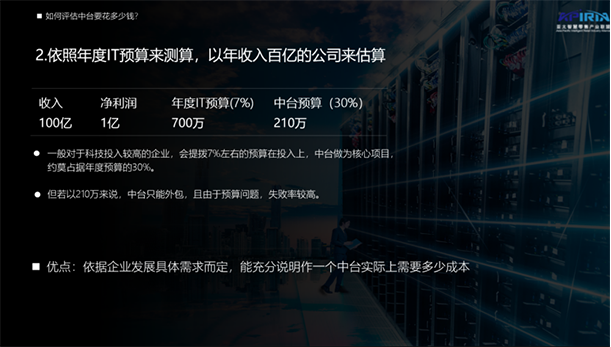 Let's make a calculation. Suppose a company with an annual revenue of 10 billion has a net profit of 100 million, and the annual IT budget generally falls within 2-7%. Suppose this company is an enterprise that attaches great importance to digital construction, and its IT budget is as high as 100 million. 7%. It is equivalent to investing 7% of the 10 billion revenue, that is, 7 million in the annual digitization project, and the middle station is the key project of the year, accounting for 30% of the budget, then 30% of the middle station budget, that is 2.1 million. But the problem is coming. If it is 2.1 million, China and Taiwan can only outsource, and due to budget problems, the failure rate is high. After all, this is a growing company with tens of billions of revenue, so it is estimated that some moderate adjustments should be made. It is not possible to formulate plans according to this dimension, but the evaluation method of this dimension has certain reference value.