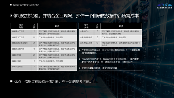 In the construction of the data center, in addition to the traditional big data team, the active participation of the business department is also required. This picture is to calculate how much the cost should be based on the actual situation. As a result, it may be estimated that the annual expenditure is 80 million. Assuming that the average salary is 400,000, the annual labor expenditure is about 42 million, plus hardware and operation and maintenance costs, about 80 million.